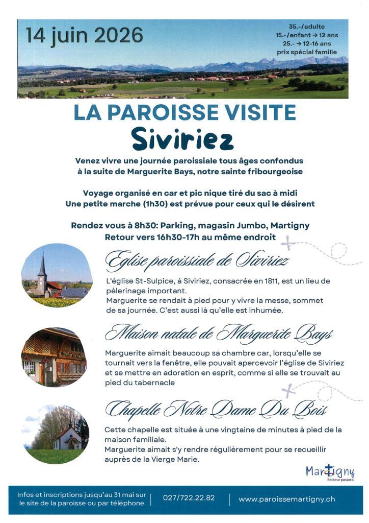 La paroisse vous invite à participer à sa sortie annuelle dans le canton de Fribourg dans les environs de Siviriez à la découverte de la vie de sainte Marguerite Bays, native du lieu. Bienvenue à tous.