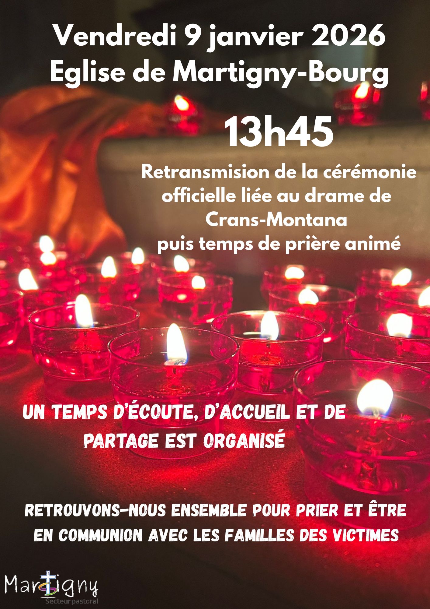 Drame de Crans-Montana – Commémoration, prière, écoute + Ajouter à mon Agenda Google + Exporter vers iCal 00 jours 00 heures 00 minutes 00 secondes Date 09 Jan 2026 Heure 13:45 Lieu Eglise de Martigny-Bourg Rossettan 9, 1920 Martigny Catégorie 0. COMMUNICATION INTERNE 0.1 Equipe pastorale 0.2 Magazine L'Essentiel Annonces Hebdo Diaconie Page Bourg Page d'accueil Page Ville SITE PUBLICATION ACTUALITÉS Partagez cet événement Rechercher :