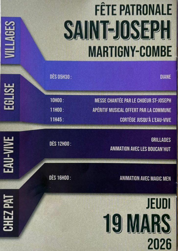 Fête patronale saint Joseph + Ajouter à mon Agenda Google + Exporter vers iCal Date 19 Mar 2026 Expired! Heure Journée entière Lieu Eglise de Martigny-Croix Rte du Soleil 17, 1921 Martigny-Croix Catégorie 0. COMMUNICATION INTERNE 0.1 Equipe pastorale 0.2 Magazine L'Essentiel Annonces Hebdo Page Combe Page d'accueil Organisateur Charlenne Giroud Téléphone 079 730 83 02 Email chacha@netplus.ch Partagez cet événement Rechercher :