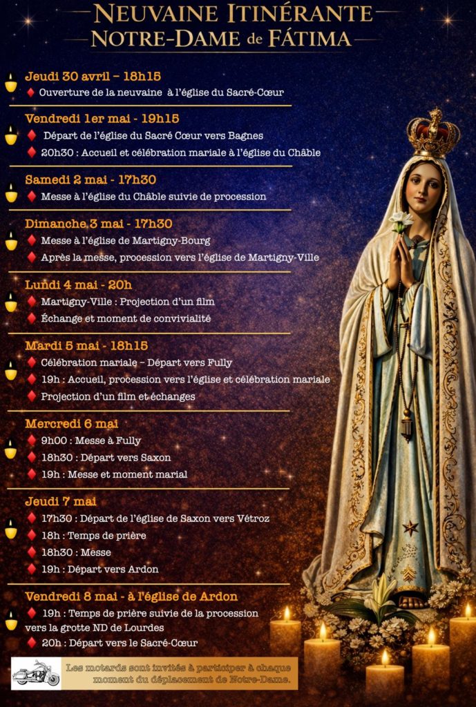 La communauté catholique portugaise du Valais, emmenée par son aumônier le P. Jose Vilas Boas, propose de vivre une neuvaine itinérante à l’occasion de la fête de Notre-Dame de Fatima du 30 avril au 8 mai 2026.