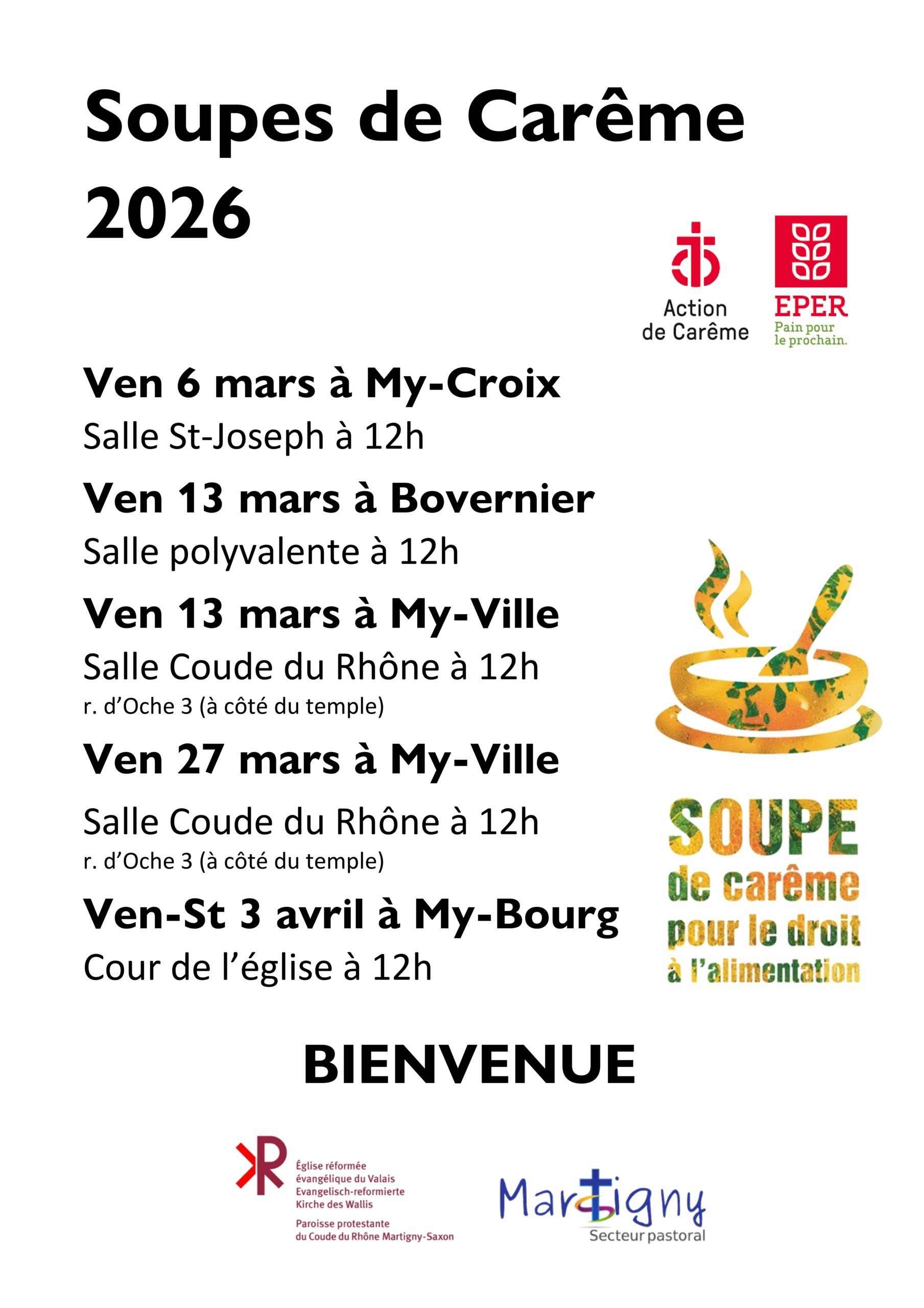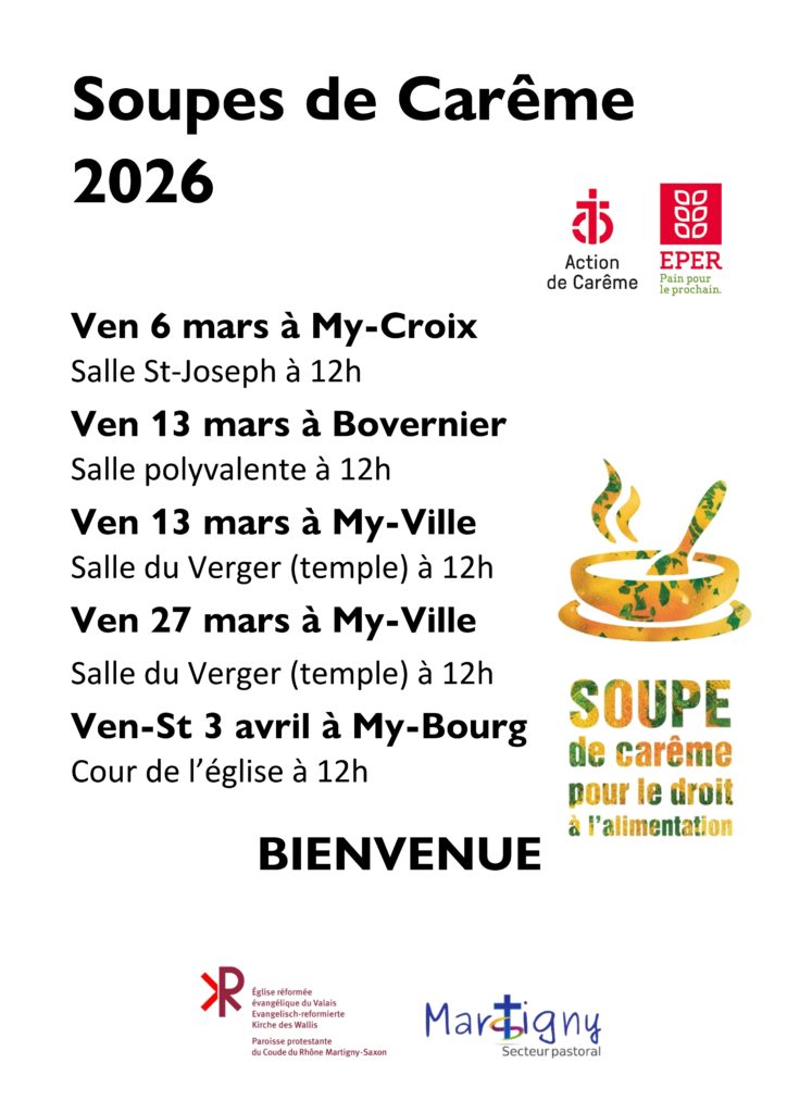 Des soupes de carême, nous rappelant l’importance du partage et de la rencontre, sont organisées en différent lieux par les paroisses protestante et catholique. Bienvenue à toutes et tous.